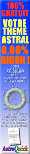 Astroo vous offre d'enrichir votre site web grâce à ses services entièrements gratuits : il suffit juste de recopier le code HTML dans le code source de votre page web. Dès lors, la mise à jour se fait automatiquement et vous n'avez plus à vous en occuper par la suite. BANNIERES ASTROO :-))